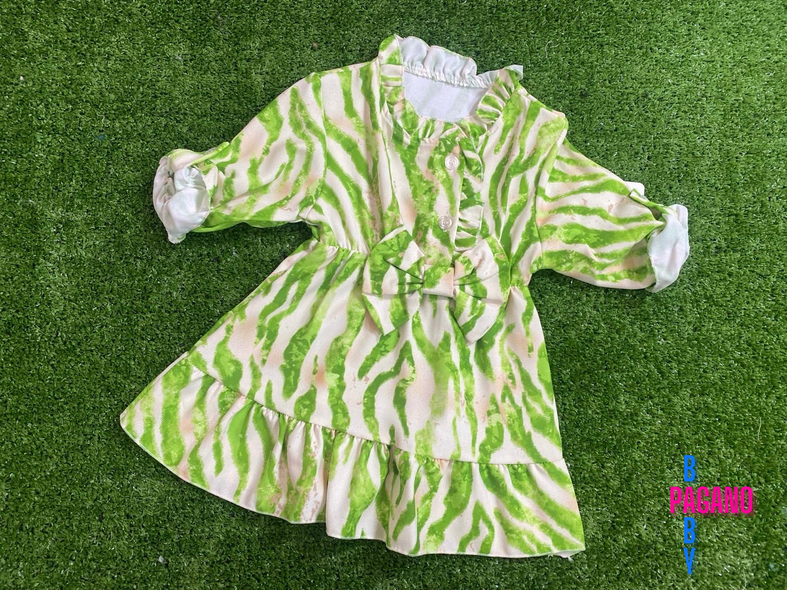Abito GREEN ZEBRA con fiocco in vita modello camicetta e maniche regolabilie a tre quarti