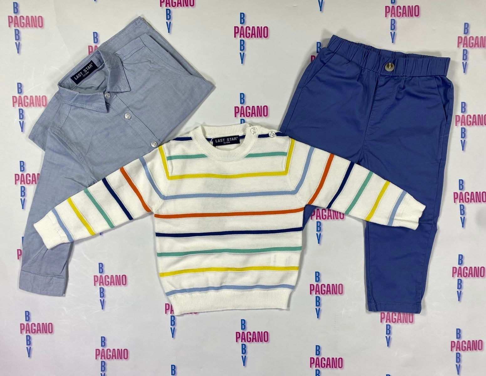 Set LAST STAR con pantalone in cotone, camicia e maglioncino in filo