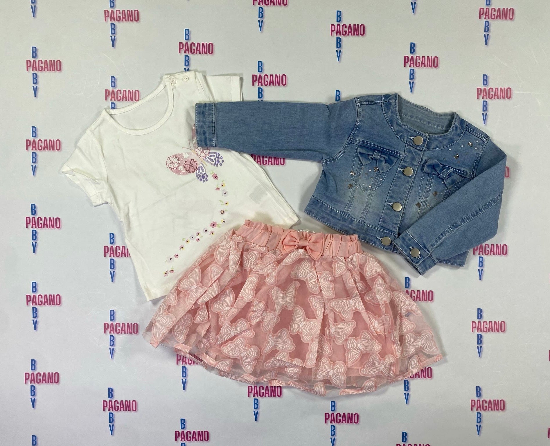 Set LOLLITOP BUTTERFLY con gonna in tulle con dettagli fiori, t-shirt e giubbotto in jeans