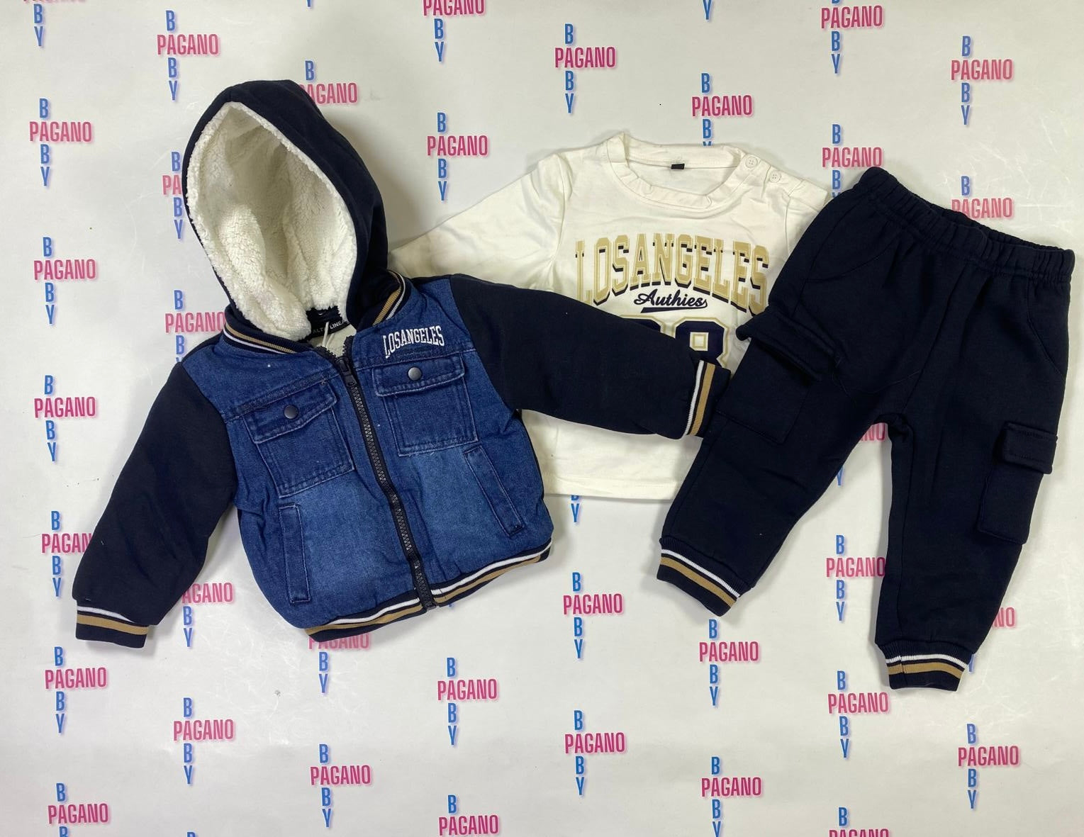 Set LOSANGELES AUTHIES tre pezzi, con pantalone in cotone felpato, lupetto e giubbotto in jeans imbottito con pelliccia!
