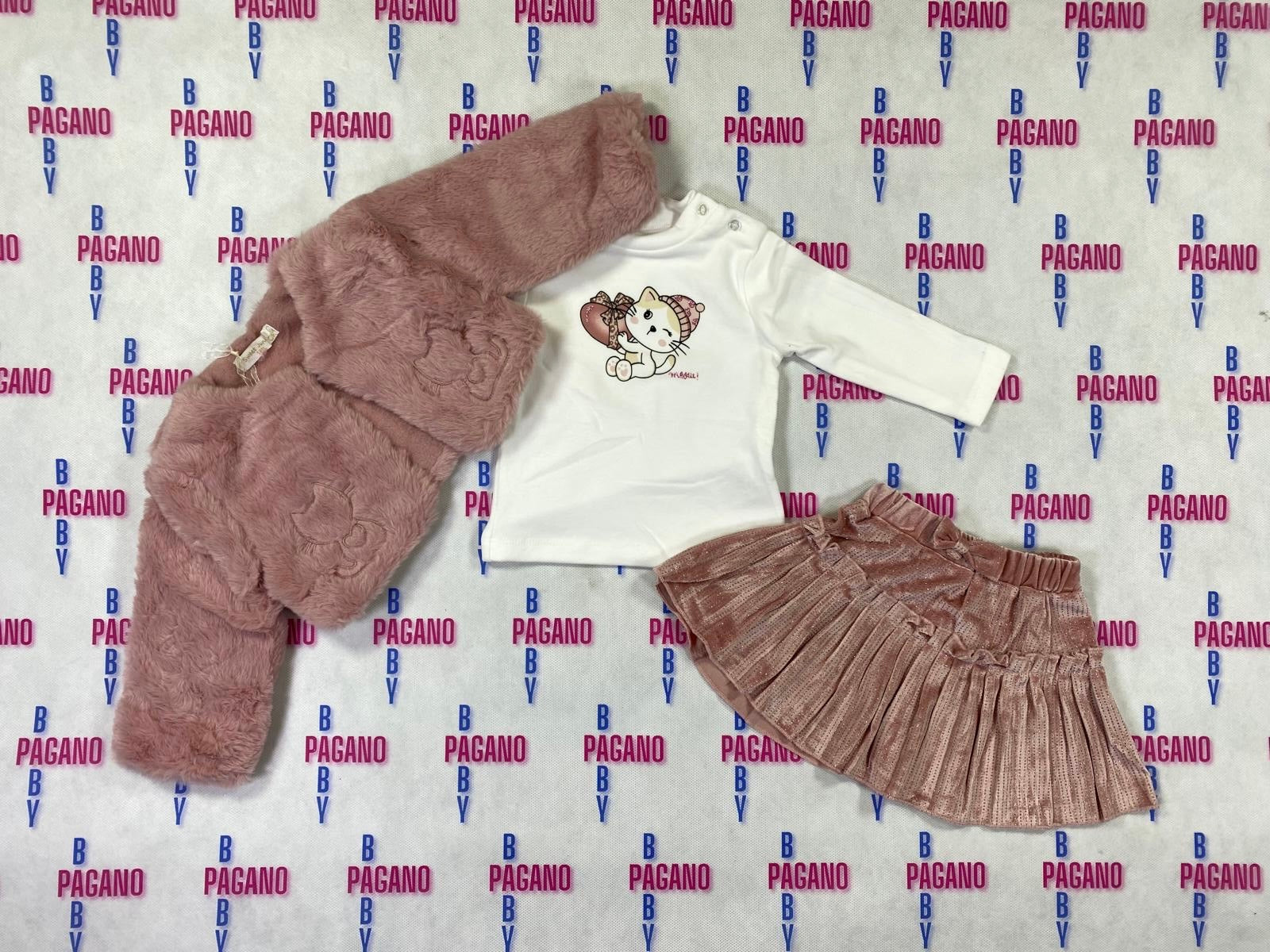 Set LOVE CAT LOVE con gonna in velluto, lupetto a mezzo collo e pelliccetta