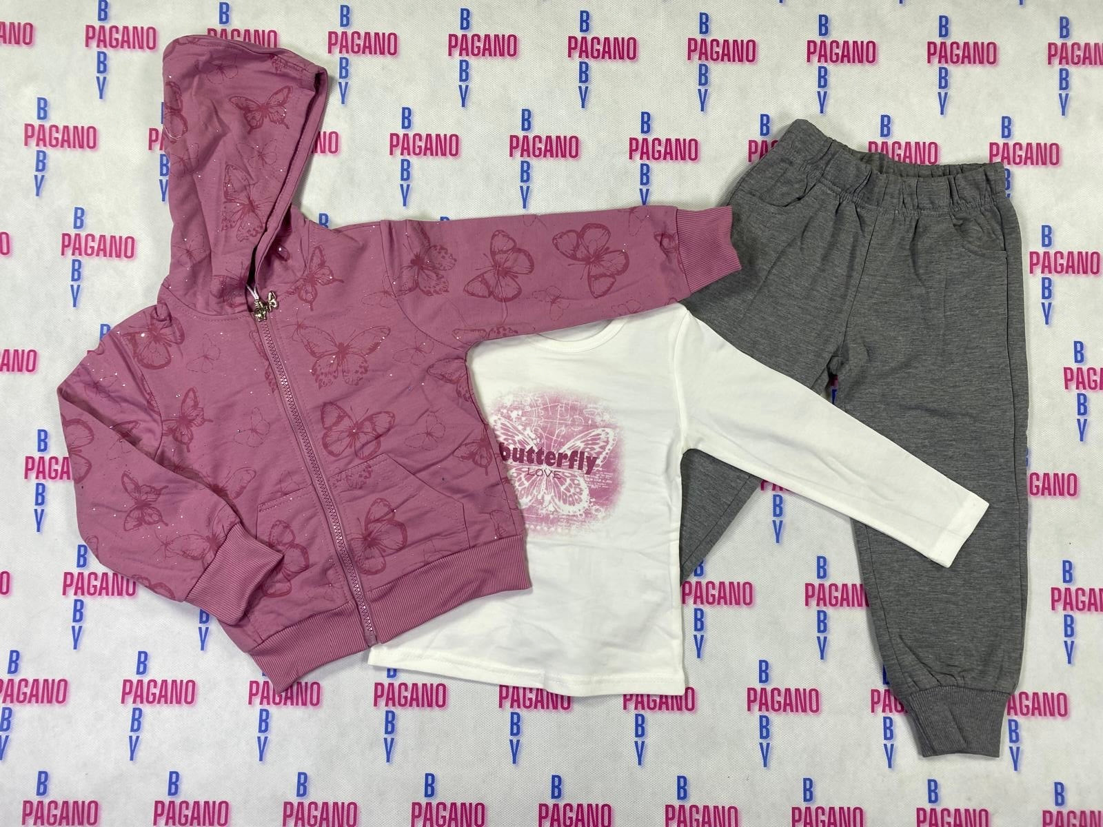 a MANY BUTTERFLY, tre pezzi con maglietta, felpa con zip e cappuccio e con panta-tuta in cotone felpato