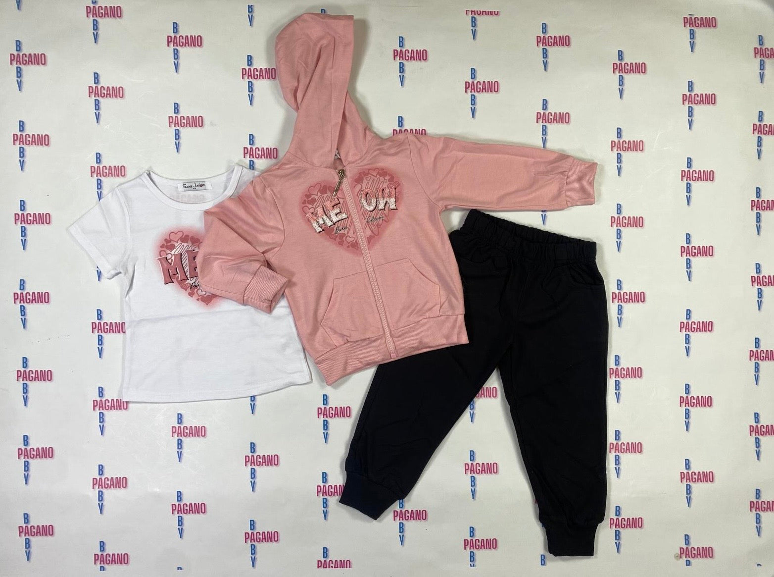 Tuta MEOW tre pezzi, con panta-tuta, t-shirt e felpa con zip e cappuccio, tutto in cotone!